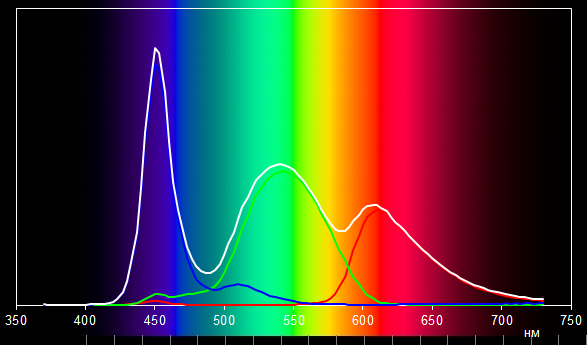 Спектры основных цветов неплохо изолированы друг от друга. И только в спектр красного цвета немного подмешивается зеленый цвет, что типично для ЖК-матриц, используемых в ноутбуках.