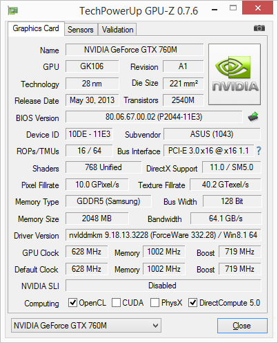 Помимо интегрированного графического ядра в ноутбуке Asus N56JR-CN181H имеется и дискретная видеокарта Nvidia GeForce GTX 760M с 2 ГБ видеопамяти GDDR5. Это не самая производительная мобильная видеокарта, но в то же время Nvidia относит ее к игровым решениям.
