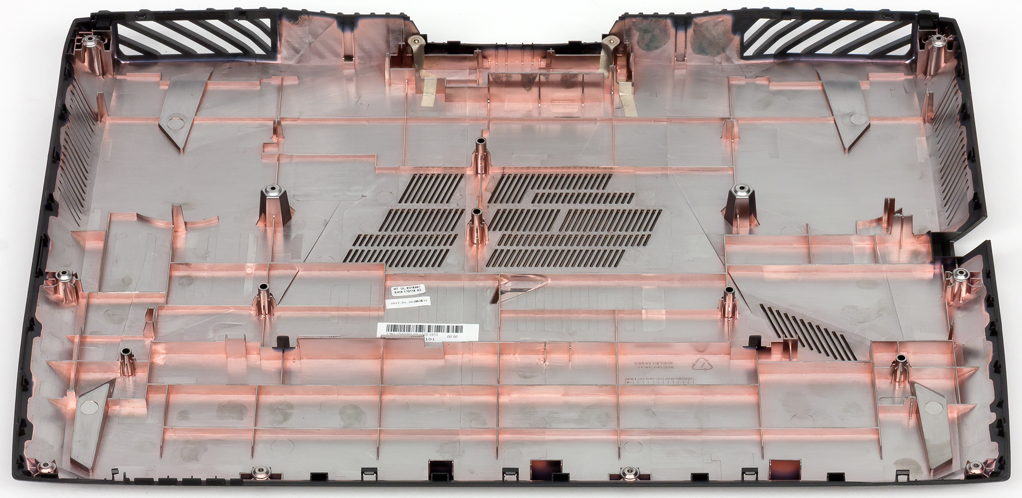 Нижняя панель корпуса ноутбука сделана из пластика серебристого цвета, стилизованного под шлифованный металл. На нижней панели расположены вентиляционные сетки. Для устойчивого положения ноутбука на горизонтальной поверхности на нижней панели есть четыре прорезиненные ножки.