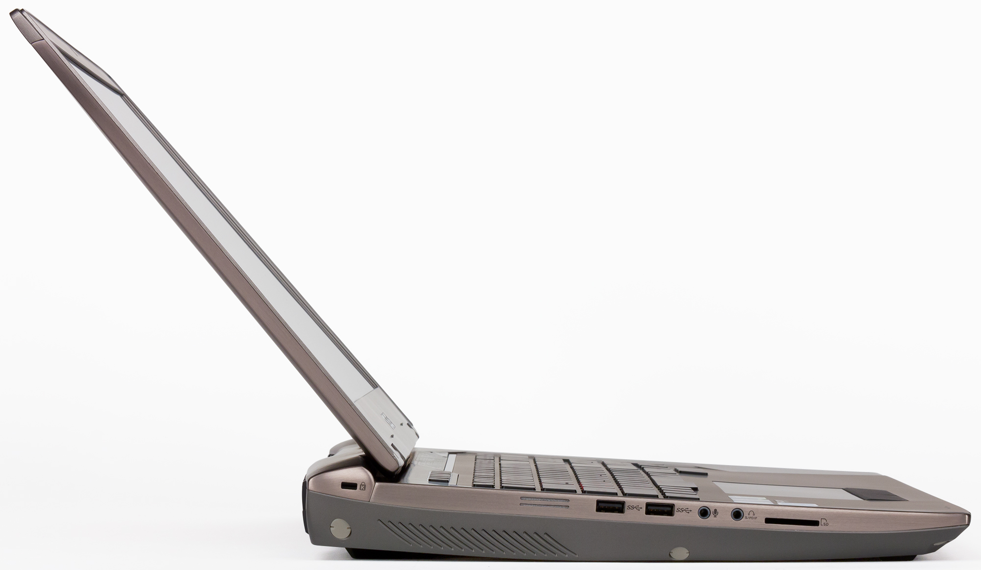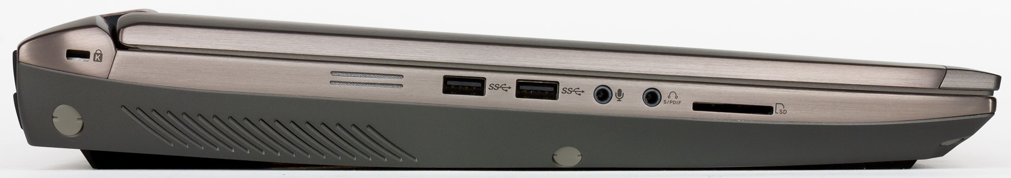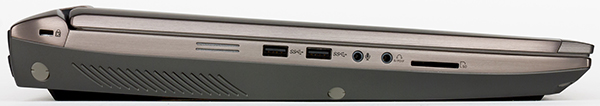 На левом торце корпуса ноутбука расположены два порта USB 3.0 (Type-A), слот для SD-карт памяти, два аудиоразъема типа миниджек и отверстие для кенсингтонского замка.