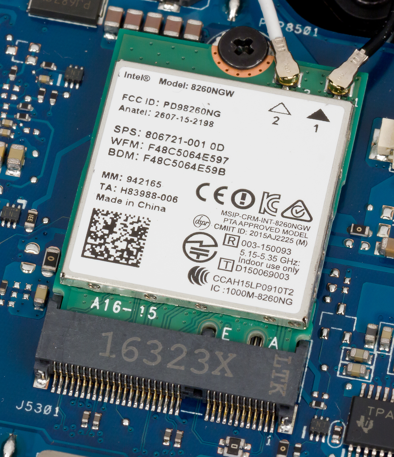 Коммуникационные возможности ноутбука определяются наличием беспроводного двухдиапазонного сетевого адаптера Intel Dual Band Wireless-AC 8260, который соответствует спецификациям IEEE 802.11a/b/g/n/ac (максимальная скорость 867 Мбит/с) и Bluetooth 4.2.