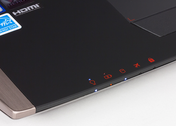 Светодиодные индикаторы состояния ноутбука расположены на переднем краю слева от тачпада. Всего таких индикаторов пять.
