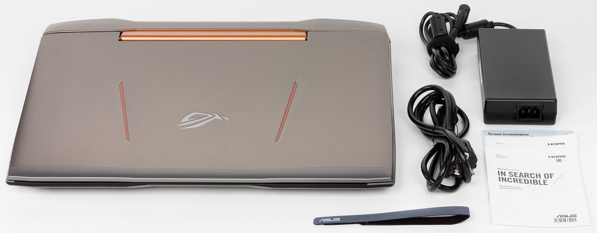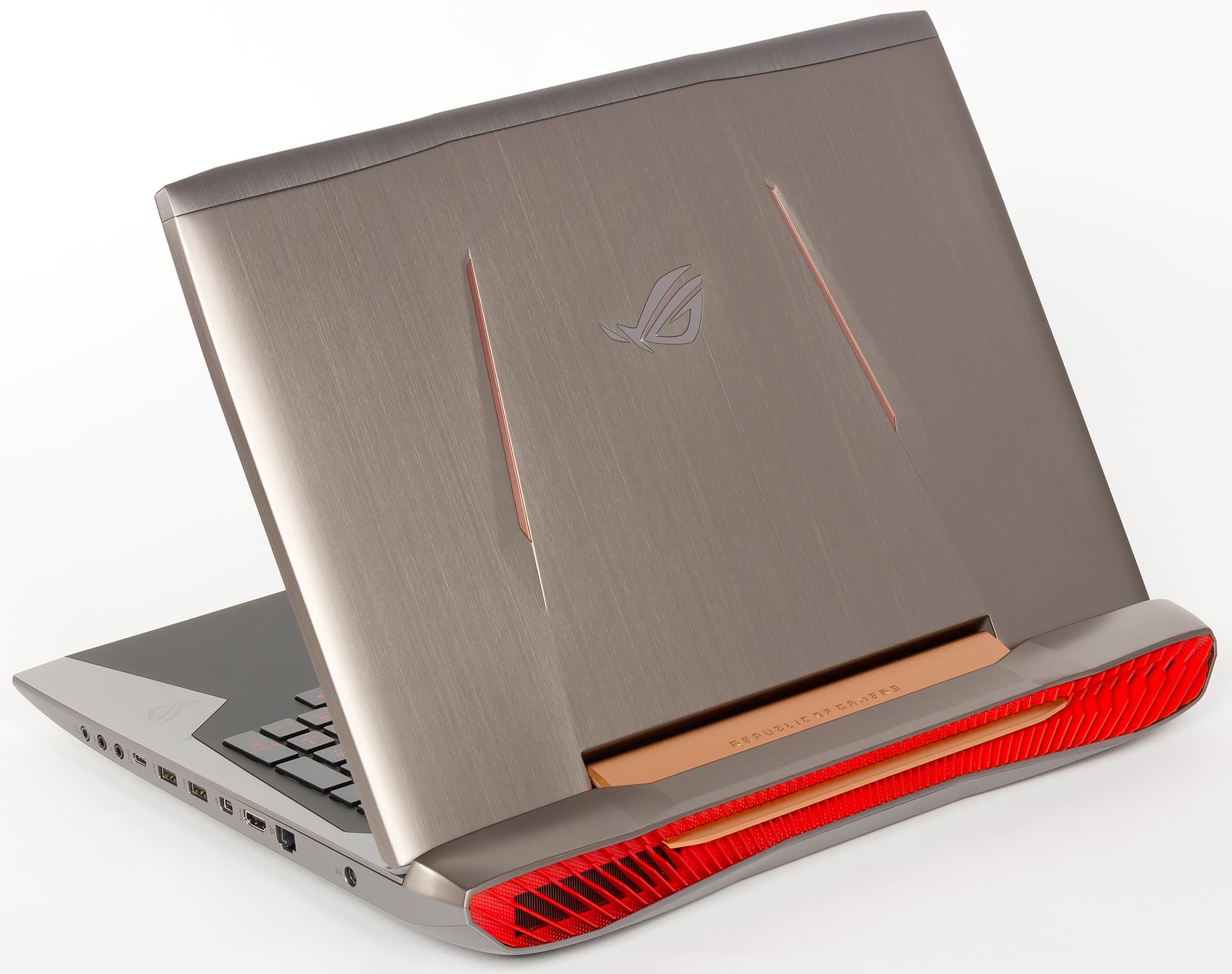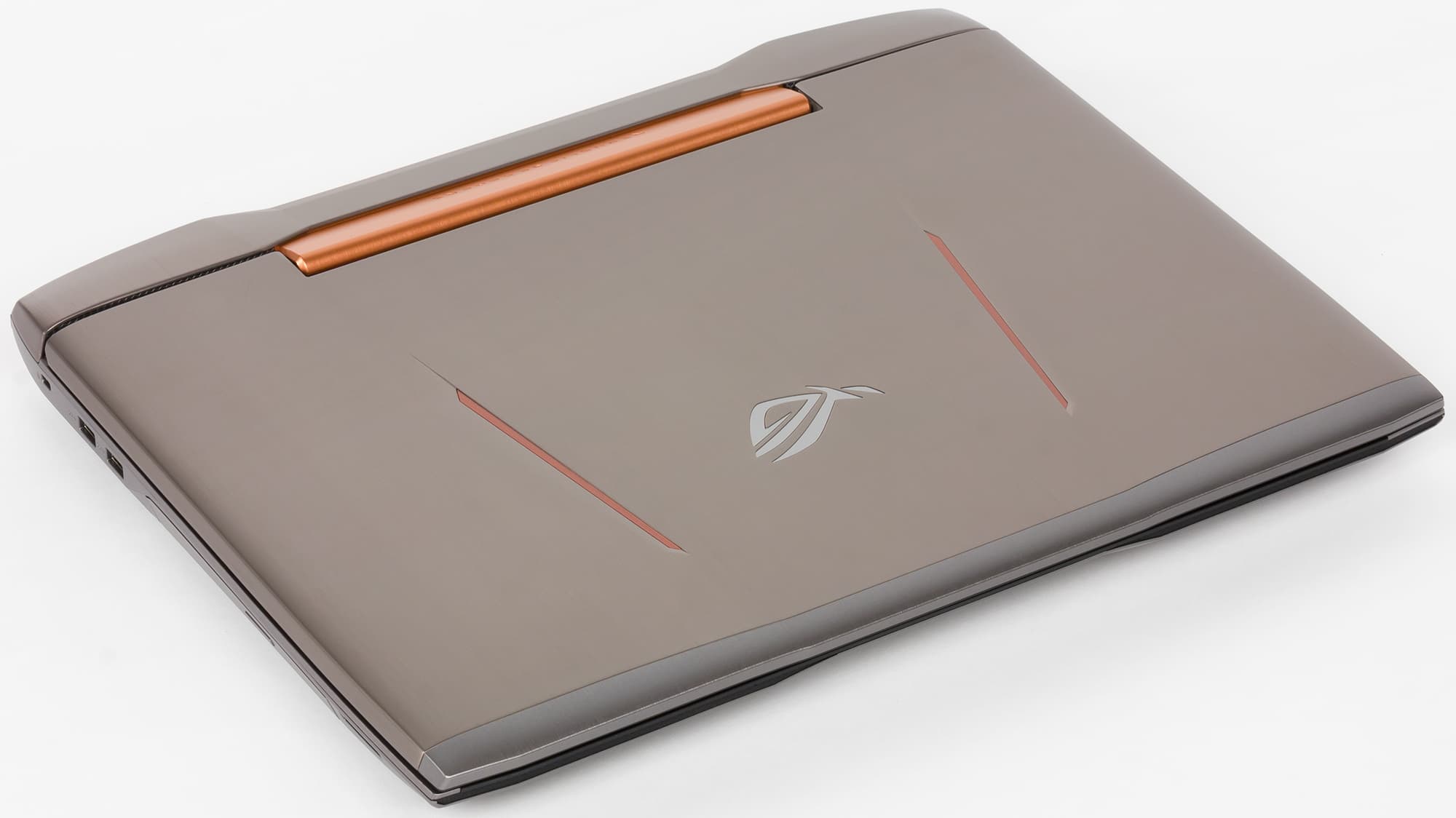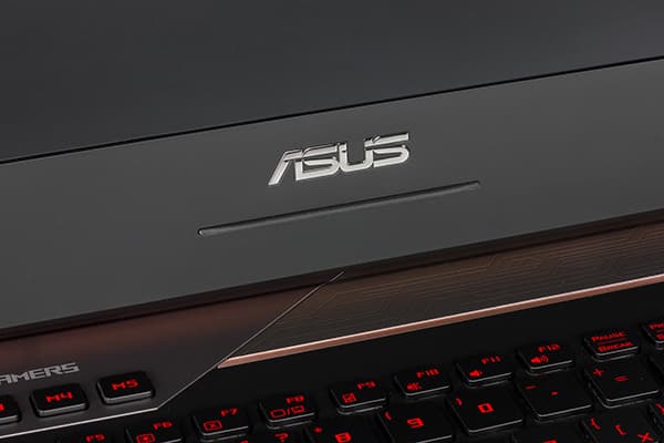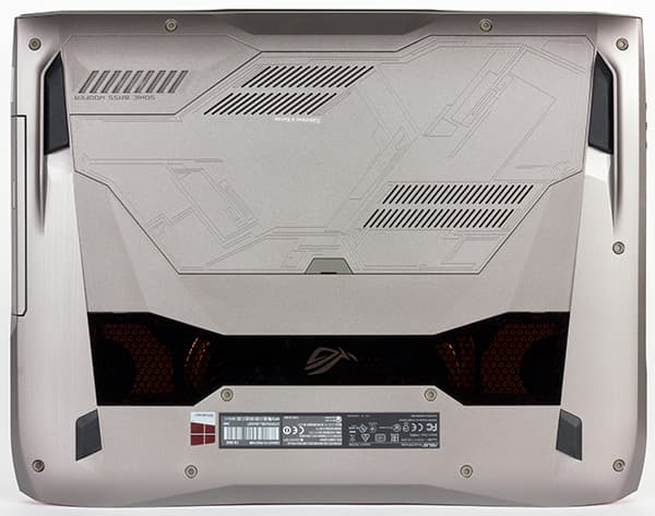 Сам корпус выполнен из пластика и металла. Крышка ноутбука имеет вставку из тонкого металлического листа серебристого цвета с отделкой под шлифованный металл. На крышке ноутбука красуется зеркальный логотип Asus ROG и две подсвечиваемые моддинговые вставки медно-оранжевого цвета.