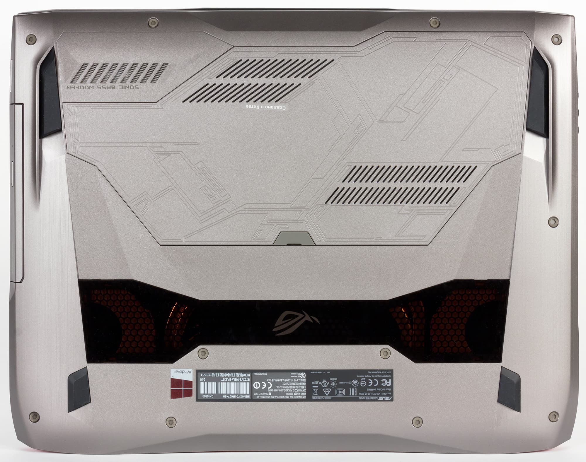 Нижняя панель корпуса ноутбука сделана из пластика серебристого цвета, стилизованного под шлифованный металл. На нижней панели расположены вентиляционные сетки, сетка сабвуфера, а также полупрозрачная вставка из черного оргстекла (исключительно моддинговый элемент). Для устойчивого положения ноутбука на горизонтальной поверхности на нижней панели есть четыре прорезиненные ножки.