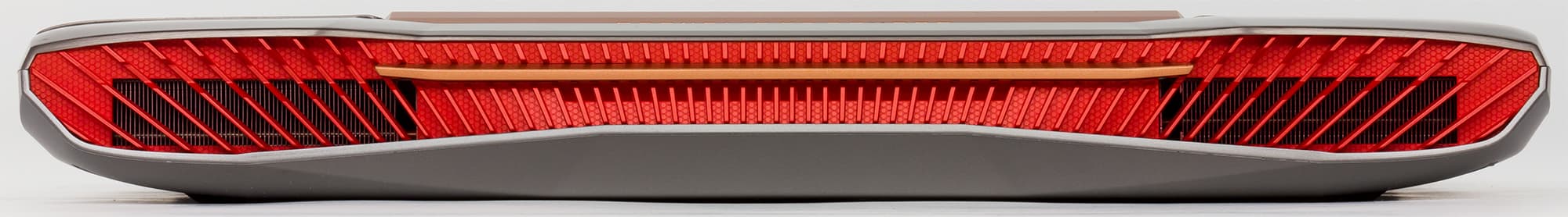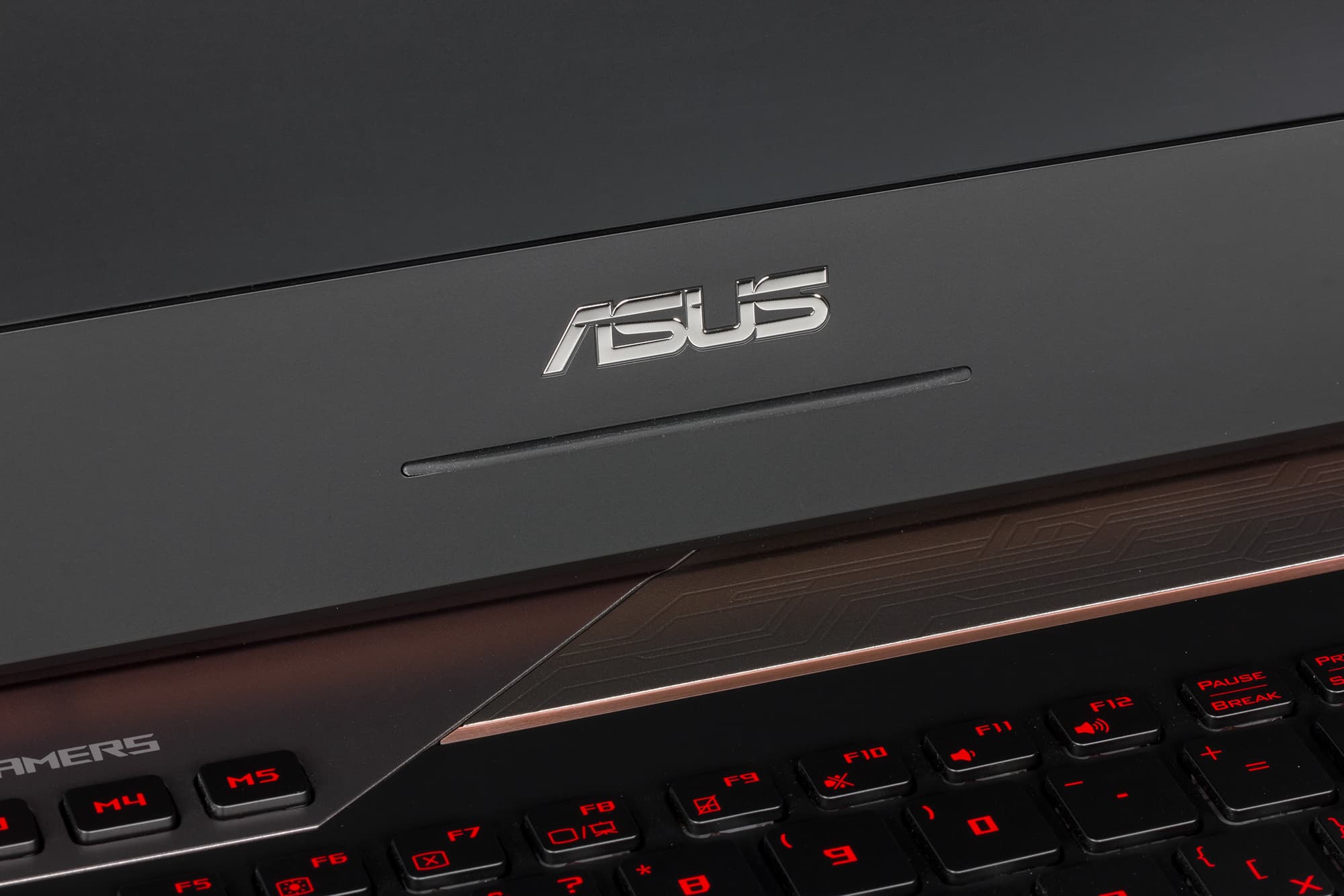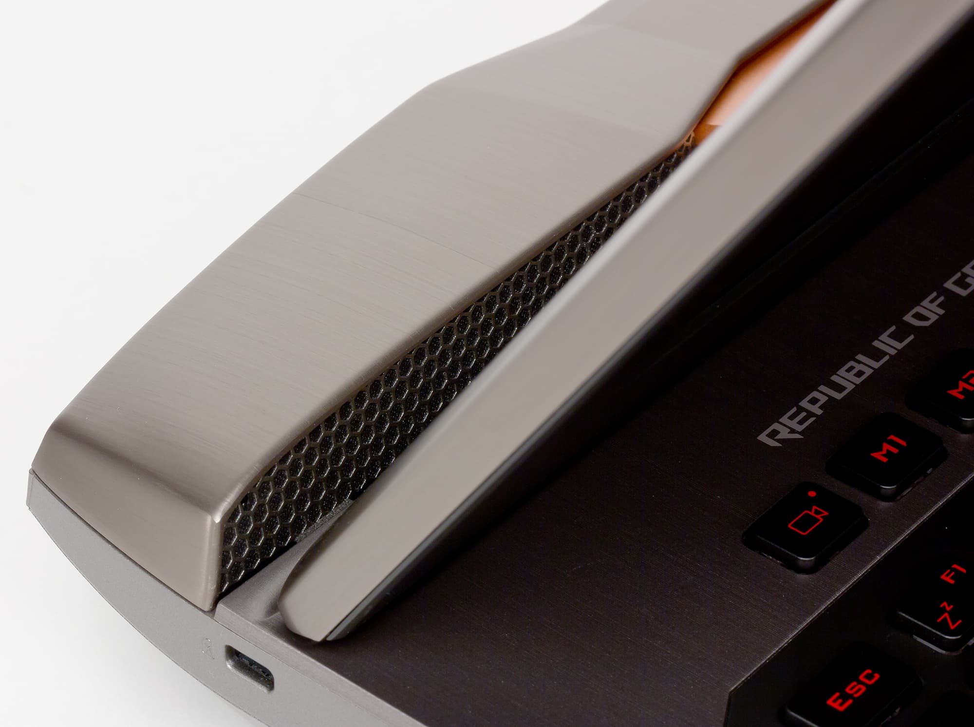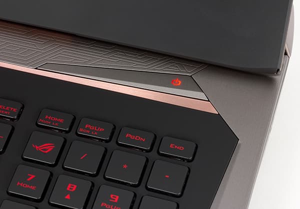 Корпус ноутбука имеет серебристый цвет с медно-оранжевыми вставками. Такой цветовое оформление называется ROG Armor Titanium and Plasma Copper.