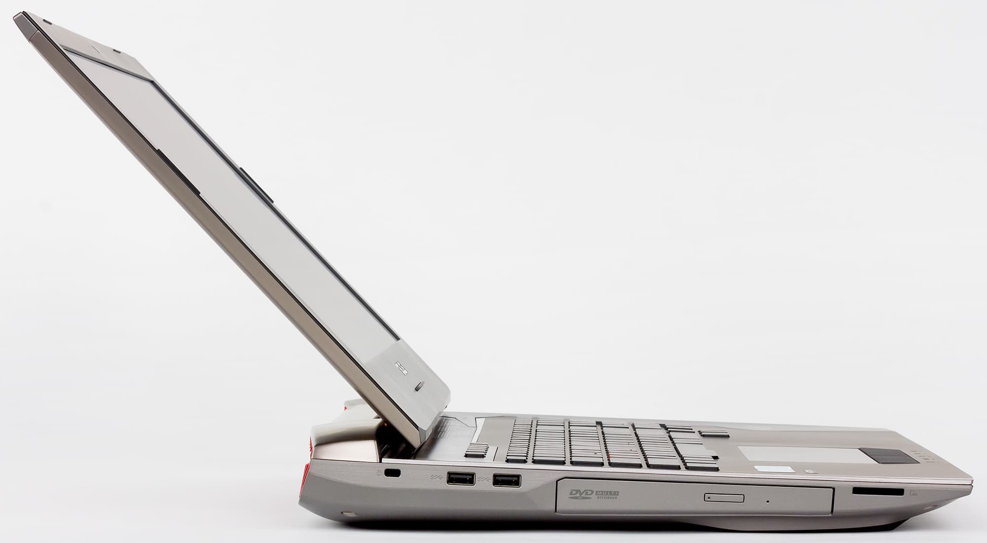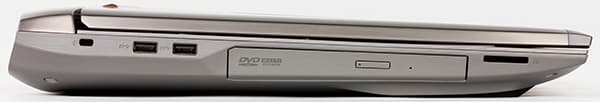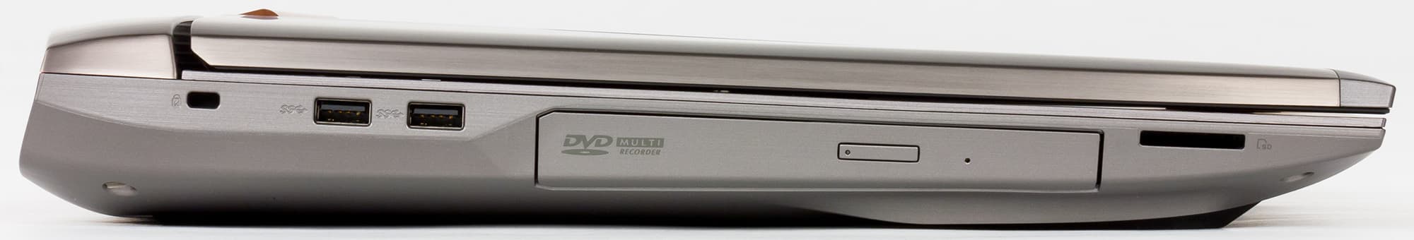 На левом торце корпуса ноутбука расположены два порта USB 3.0, лоток оптического привода, слот для SD-карт памяти и отверстие для кенсингтонского замка.