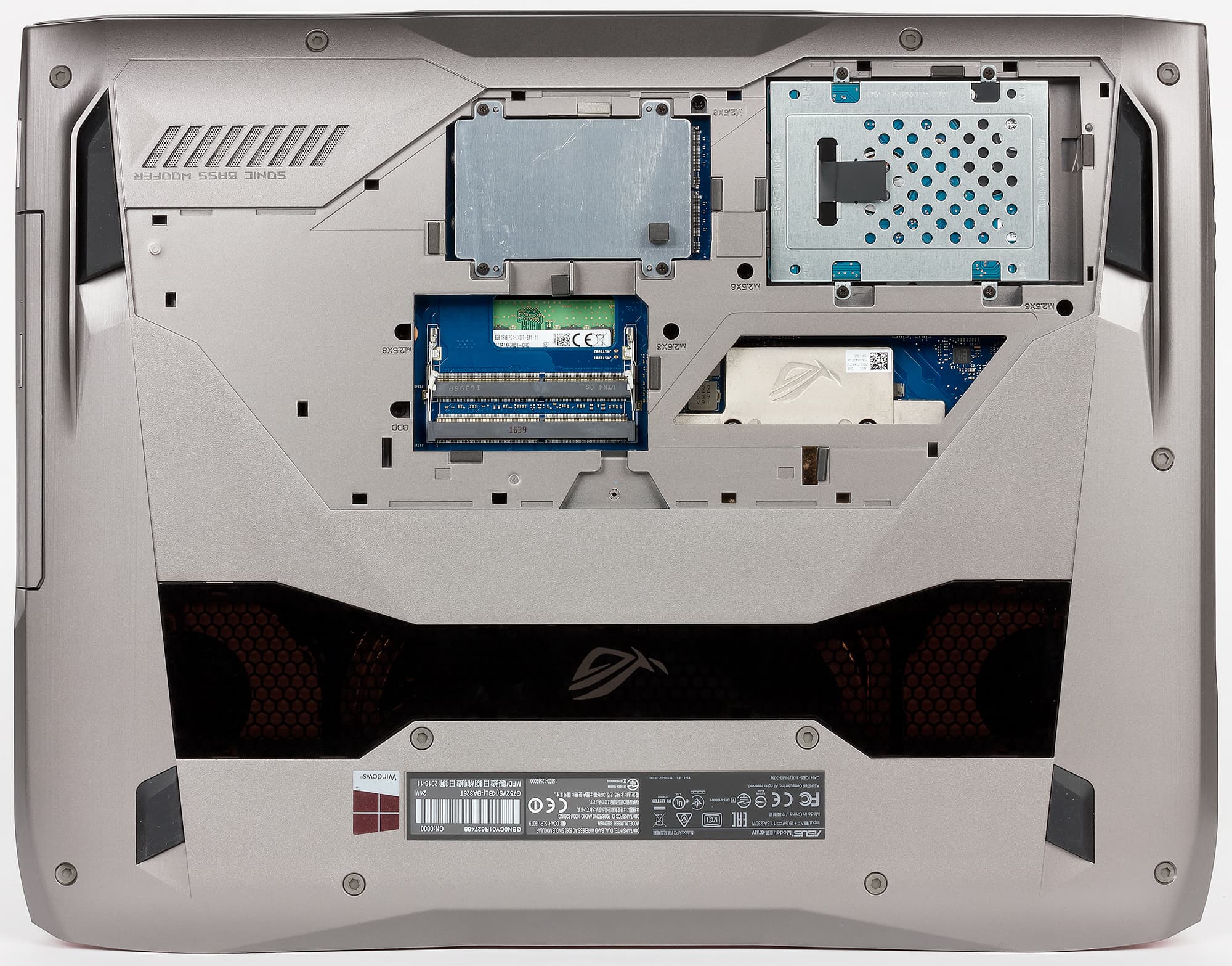 На нижней панели корпуса ноутбука Asus ROG G752VSK имеется лючок, который крепится всего одним винтиком. Если его снять, то можно получить доступ к жесткому диску, SSD-накопителям и двум из четырех слотов для модулей памяти.