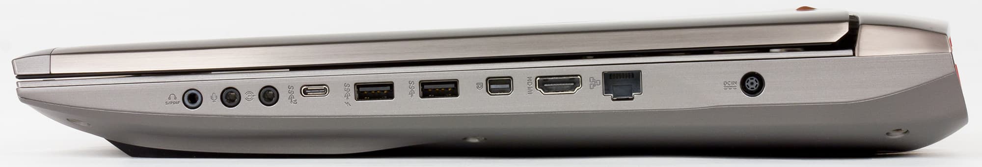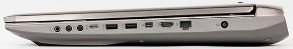 На правом торце имеется еще два порта USB 3.0, порт USB 3.1 (Type-C), видеовыходы HDMI и Mini-DisplayPort, разъем RJ-45, три аудиоразъема типа миниджек и разъем питания.