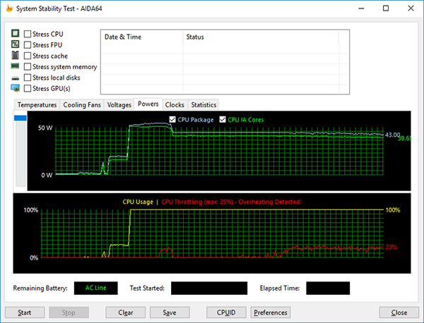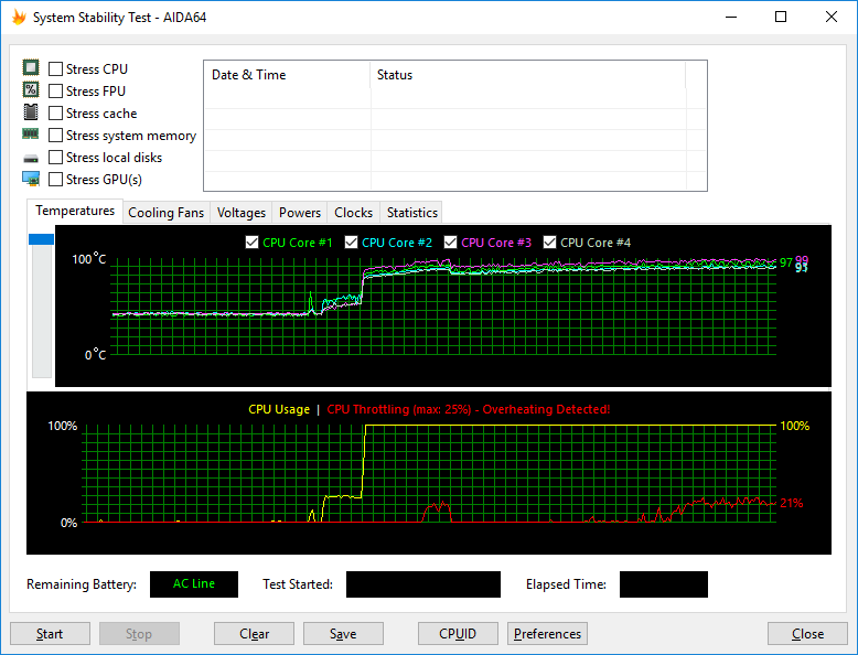 При одновременной стрессовой загрузке процессора и видеокарты (FurMark) частота ядер процессора не меняется и составляет 3,2 ГГц (может кратковременно опускаться до 3,1 ГГц). А температура ядер процессора увеличивается до 97 °С. Мощность энергопотребления процессора в этом режиме составляет 43 Вт. На троттлинг, который показывает утилита AIDA64, обращать внимания не стоит. Никакого троттлинга тут, конечно же, нет.