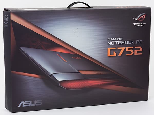 Ноутбук Asus ROG Asus G752 поставляется в картонной коробке с ручкой, оформленной в фирменном стиле Asus ROG.