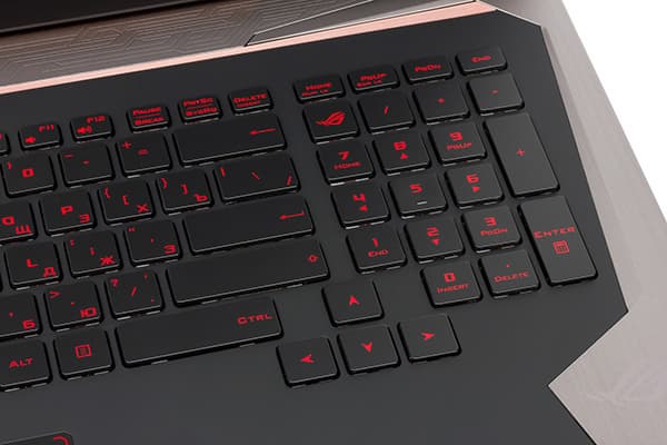 В ноутбуке Asus ROG G752VSK используется клавиатура островного типа с увеличенным расстоянием между клавишами. Имеется отдельный цифровой блок NumPad.