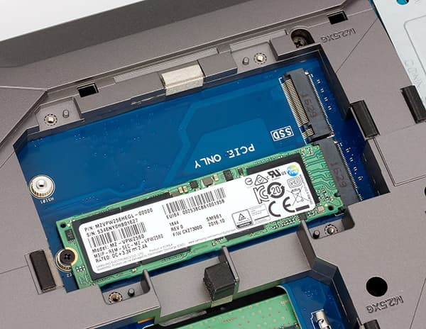 Подсистема хранения данных ноутбука может быть различной. В ноутбуке имеется два разъема M.2, которые поддерживают только PCIe-накопители, то есть в максимальной комплектации можно установить два NVMe-накопителя с интерфейсом PCIe 3.0 x4. В нашем варианте в ноутбуке был установлен только один NVMe-накопитель Samsung MZVPW256HEGL емкостью 256 ГБ.