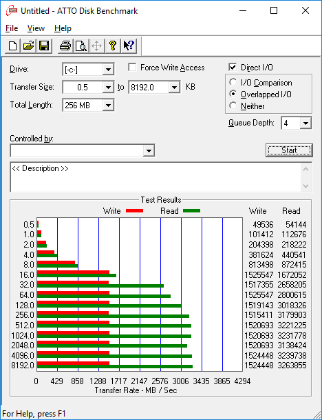 Для этого накопителя утилита ATTO Disk Benchmark определяет максимальную скорость последовательного чтения на уровне 3,2 ГБ/с, а скорость последовательной записи — на уровне 1,5 ГБ/с. Это рекордно высокий результат для одного накопителя.
