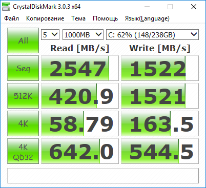 Результат тестирования накопителя утилитой CrystalDiskMark немного скромнее по скорости последовательного чтения. По данным теста, она составляет 2,5 ГБ/с, а скорость последовательной записи точно такая же, как в тесте ATTO Disk Benchmark — 1,5 ГБ/с. Более низкая скорости последовательного чтения, выдаваемая утилитой CrystalDiskMark, объясняется тем, что в утилите ATTO Disk Benchmark используется глубина очереди задач равная 4, а в утилите CrystalDiskMark глубина очереди равна 1.