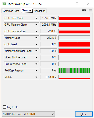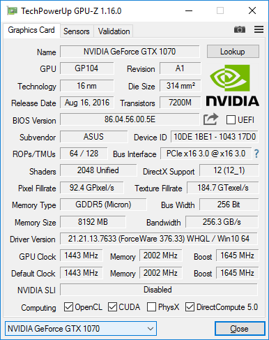 Базовая частота графического процессора Nvidia GeForce GTX 1070 составляет 1443 МГц, а в режиме GPU Boost она может достигать 1645 МГц. Как выяснилось в ходе тестирования, при стрессовой загрузке (FurMark 1.18.1.0) видеокарты Nvidia GeForce GTX 1070 в установившемся режиме частота GPU составляет 1556 МГц, а частота памяти GDDR5 составляет 2003 МГц.