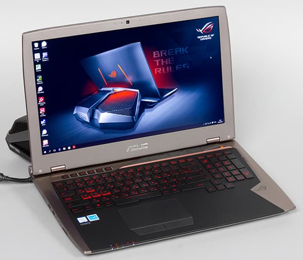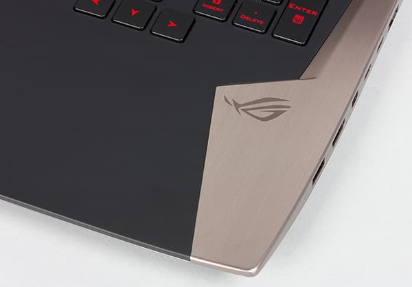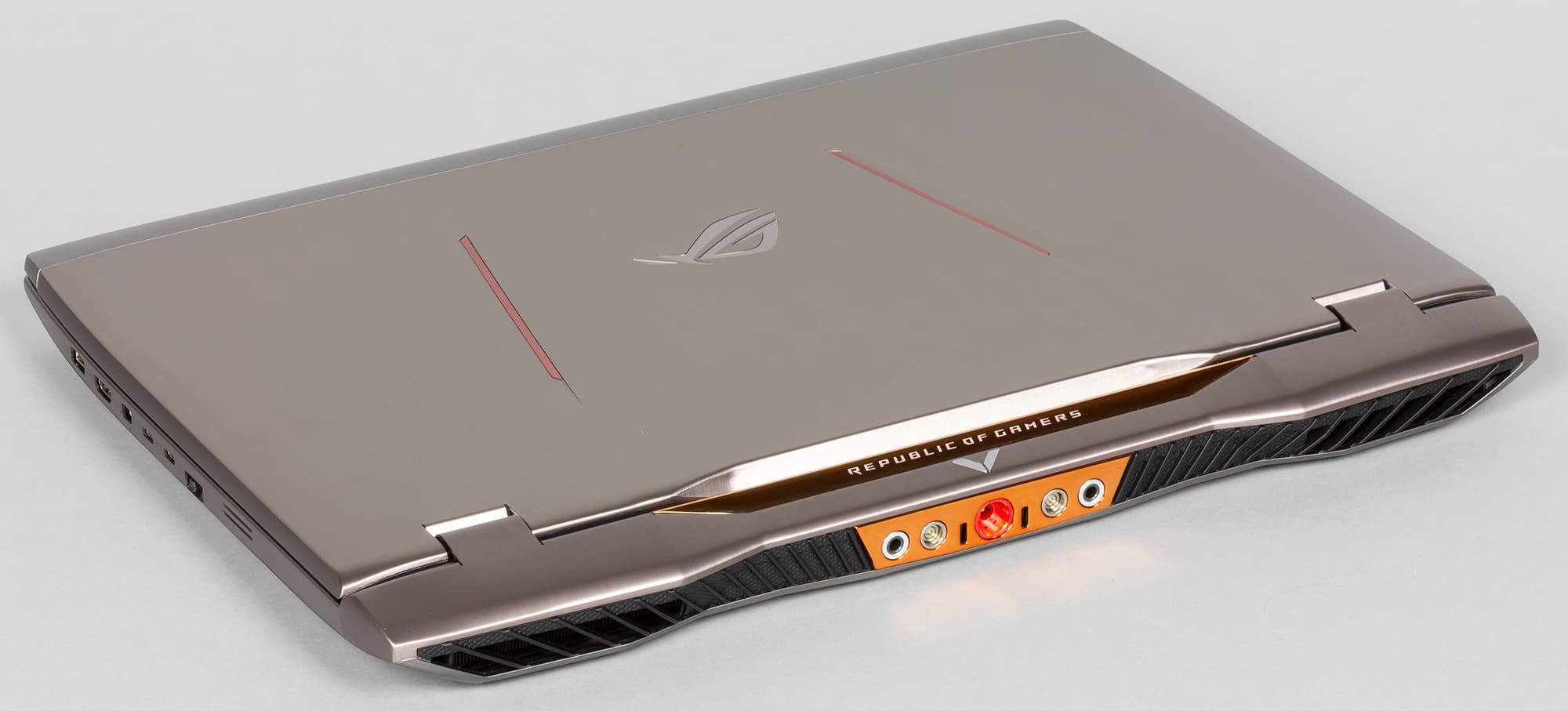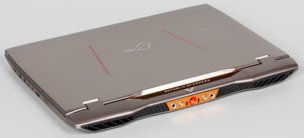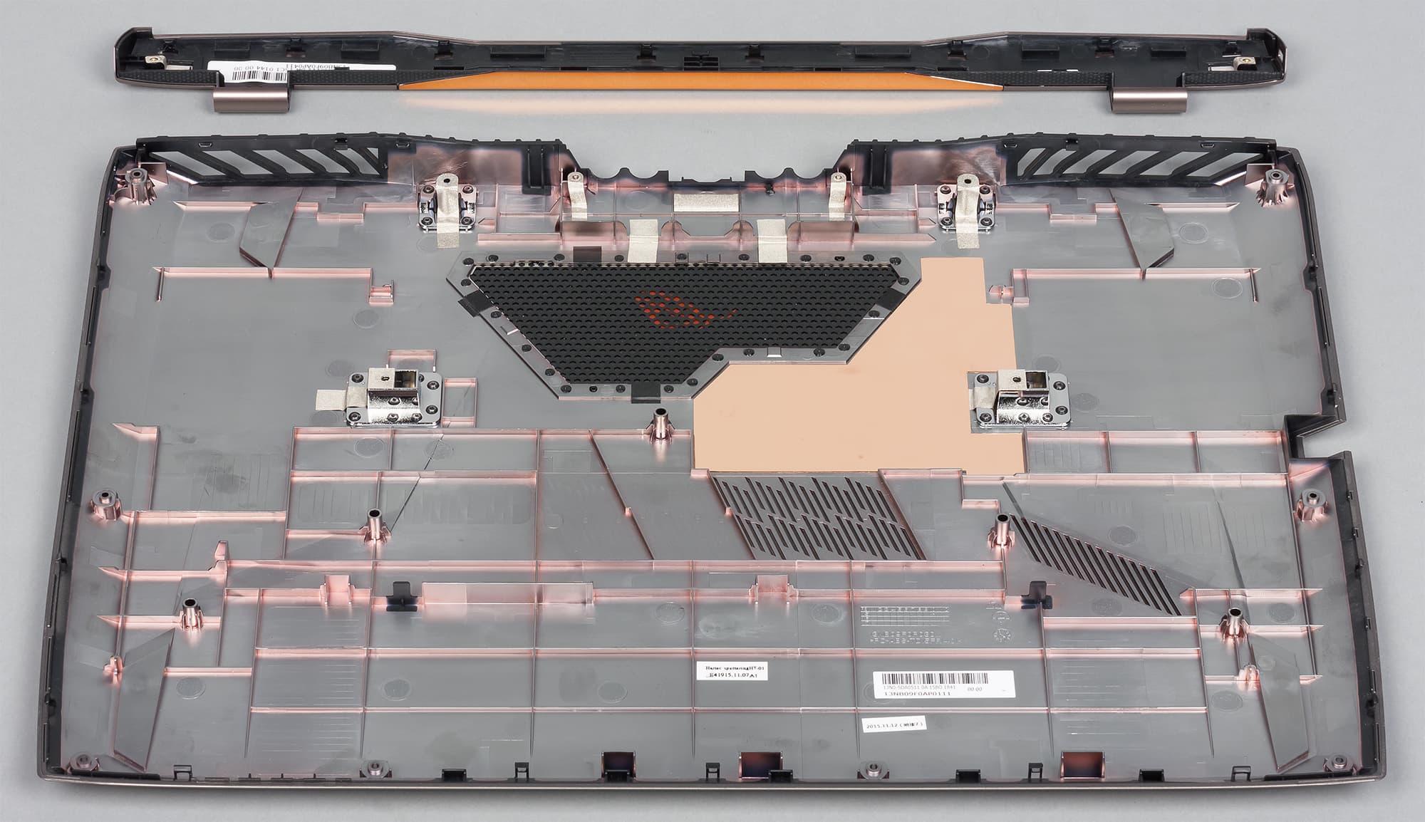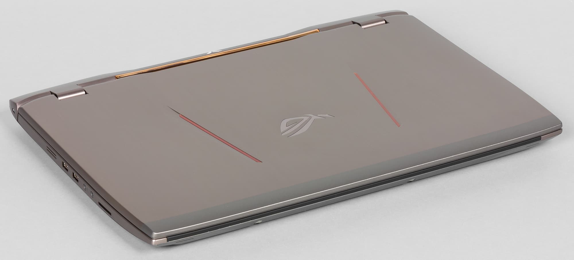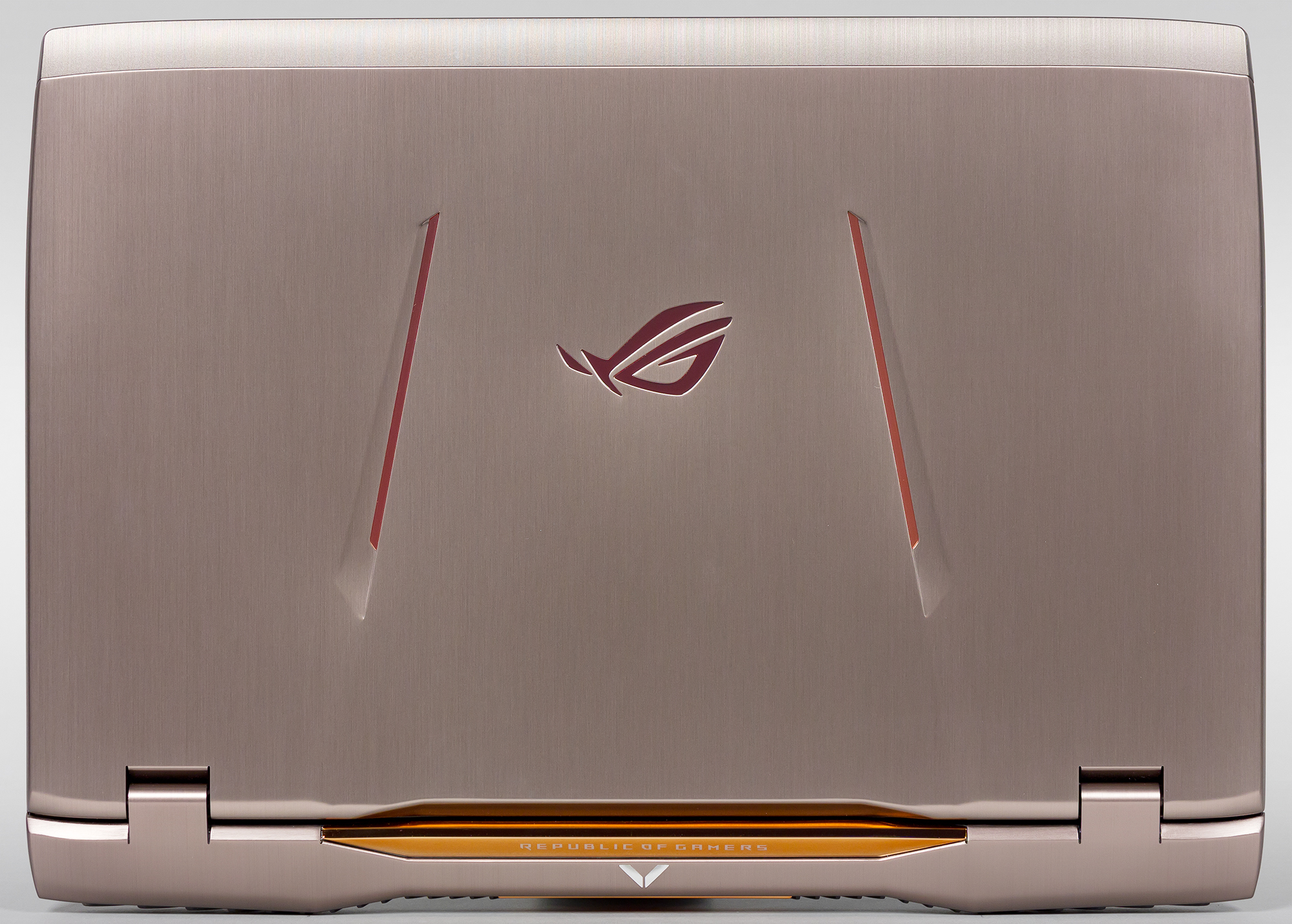 Корпус выполнен из пластика и металла. Крышка ноутбука сделана из шлифованного алюминия серебристого, немного с бронзовым отливом цвета. На крышке красуется зеркальный подсвечиваемый логотип Asus ROG и две подсвечиваемые моддинговые вставки медно-оранжевого цвета.