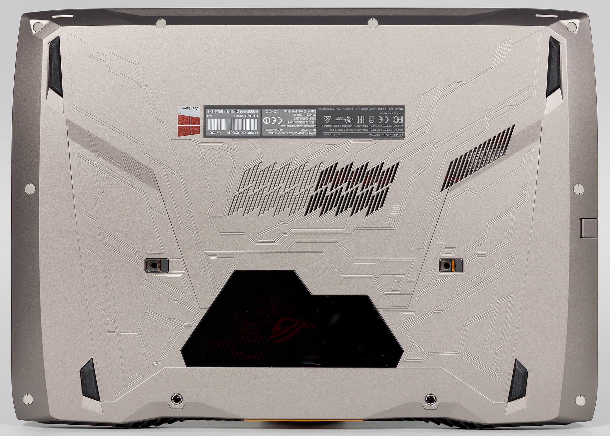 Ноутбук Asus ROG GX700VO можно достаточно просто разобрать. Для этого необходимо открутить 12 винтиков, часть которых закрыта резиновыми заглушками, на нижней панели корпуса и снять саму нижнюю панель.