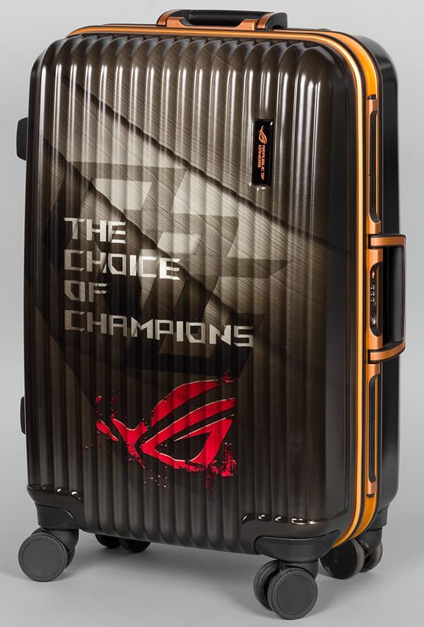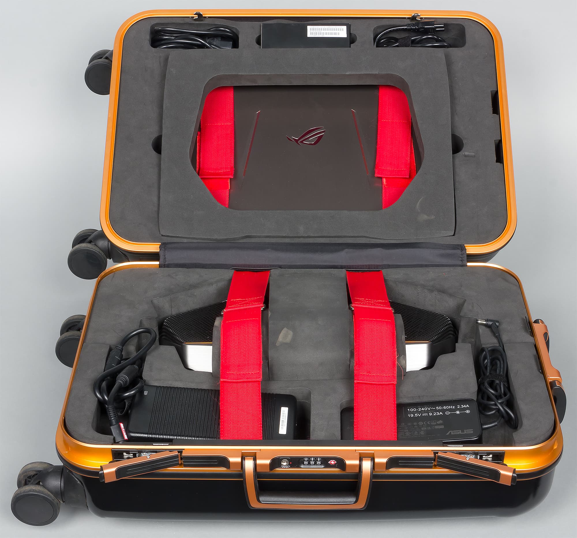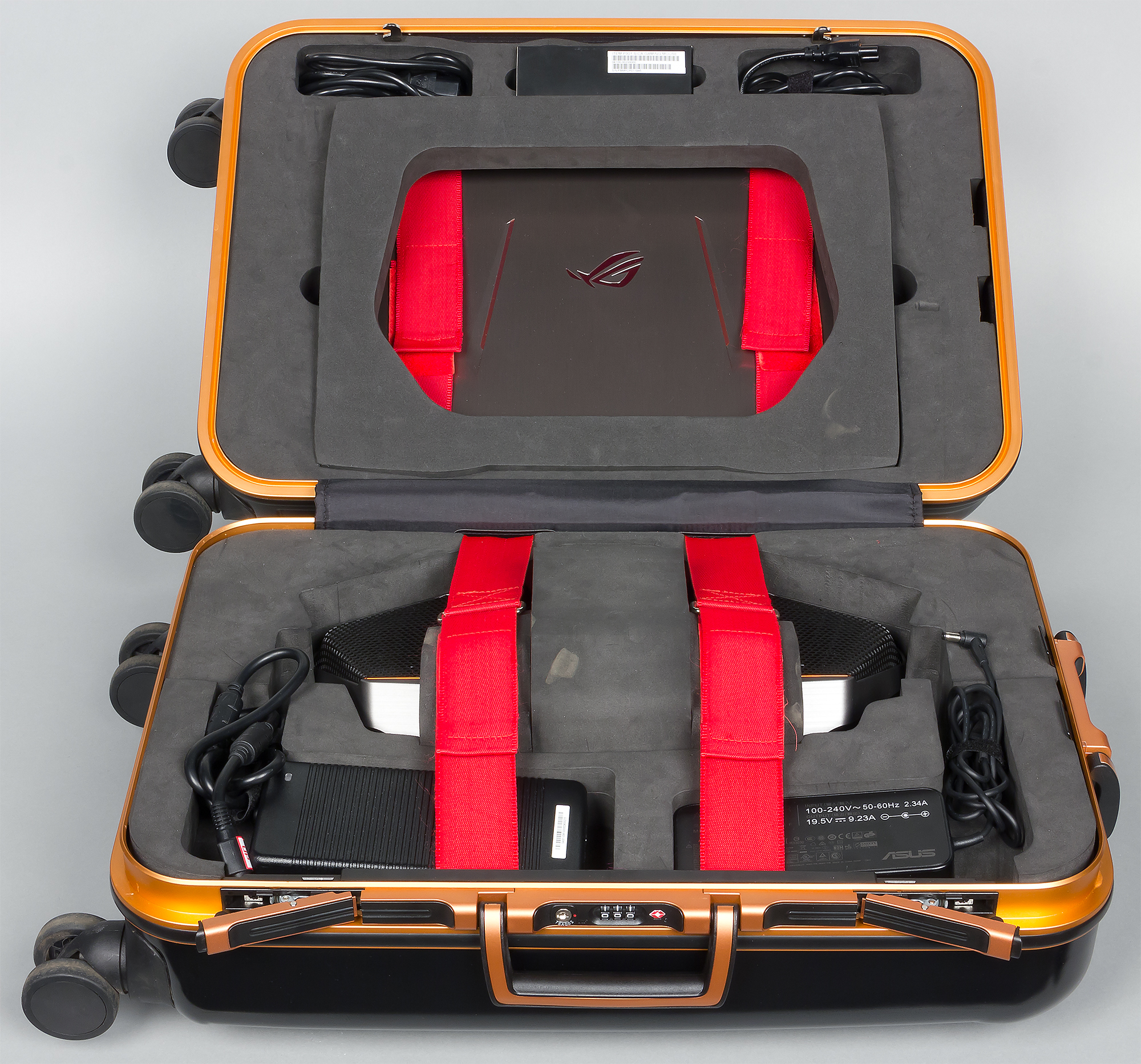 В ноутбуке Asus ROG GX700VO необычно все, даже его упаковка. Он поставляется в огромной черной картонной коробке, внутри которой скрывается чемодан. Да-да, именно пластиковый чемодан из разряда тех, с которыми путешествуют, на четырех колесиках, с выдвижной ручкой и кодовым замком. На чемодане имеется принт с логотипом Asus ROG и надписью «The choice of champions» («Выбор чемпионов»).