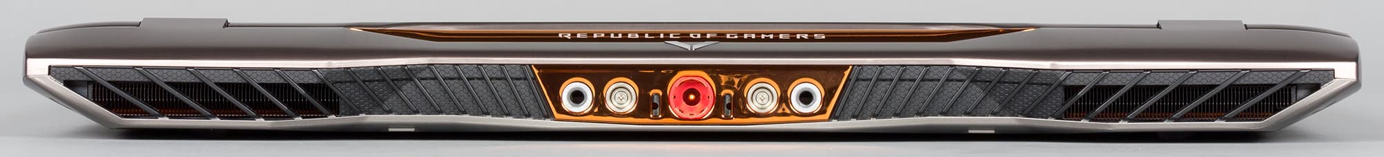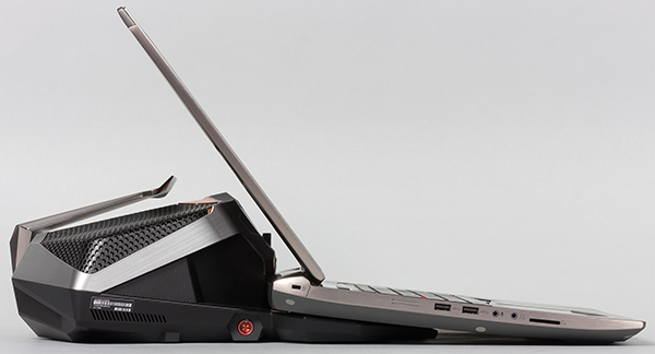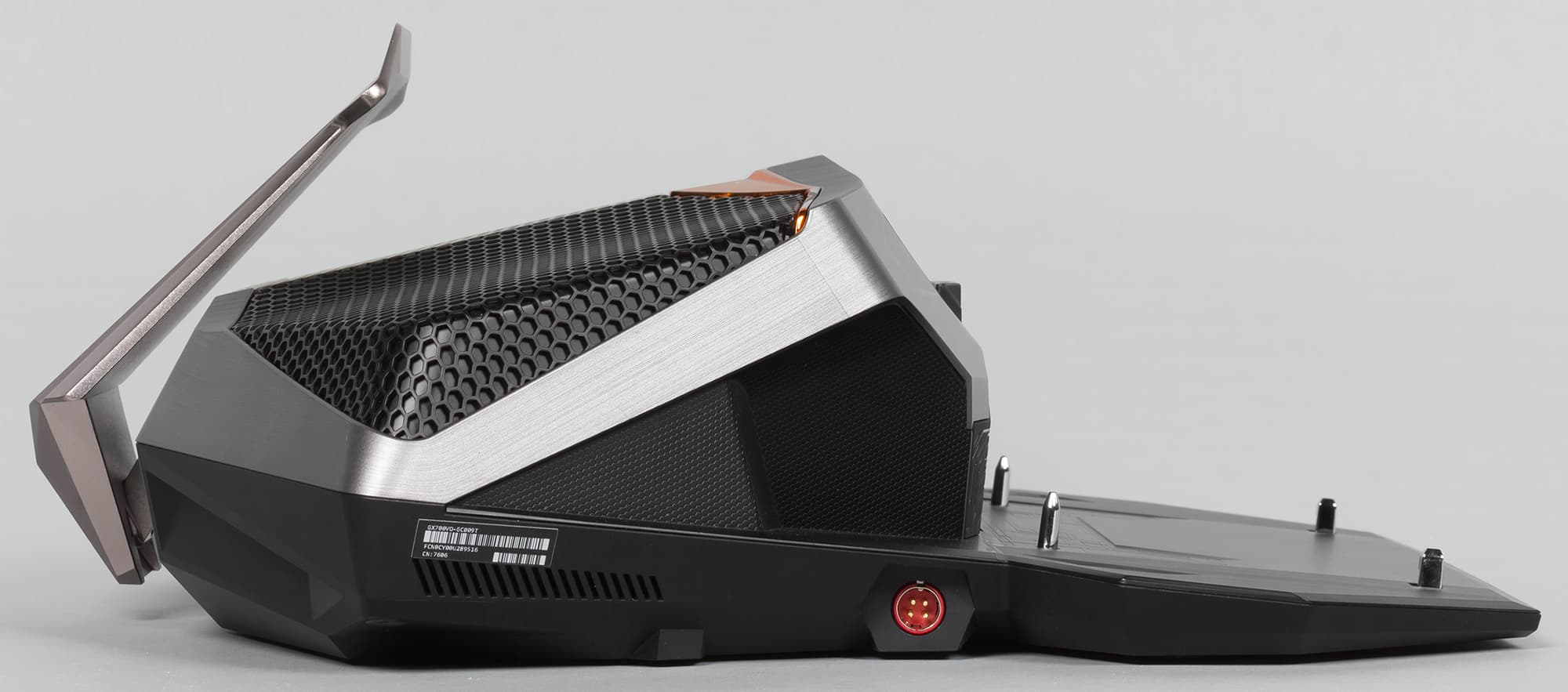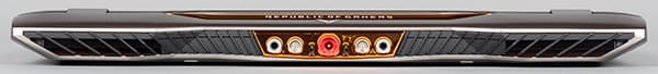 На заднем торце корпуса расположена вентиляционная решетка для выдува горячего воздуха, а также коннектор для подключения док-станции. Этот коннектор включает два патрубка для подключения жидкостной системы охлаждения, а также разъем питания. Дело в том, что при подключении док-станции ноутбук запитывается через нее, а уже док-станция подключается к электросети. Если же ноутбук используется без док-станции, то адаптер питания подключается прямо к ноутбуку через тот же разъем питания, входящий в разъем для подключения док-станции.