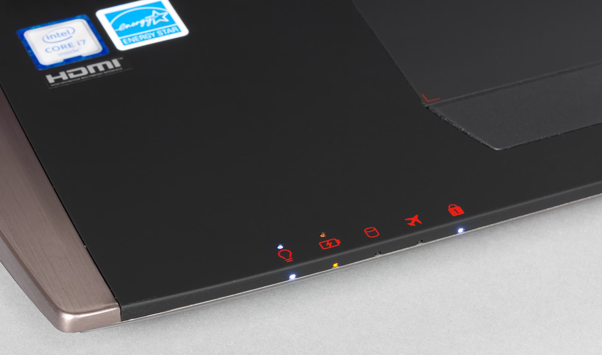 Светодиодные индикаторы состояния ноутбука расположены перед кнопками тачпада. Всего таких индикаторов пять.