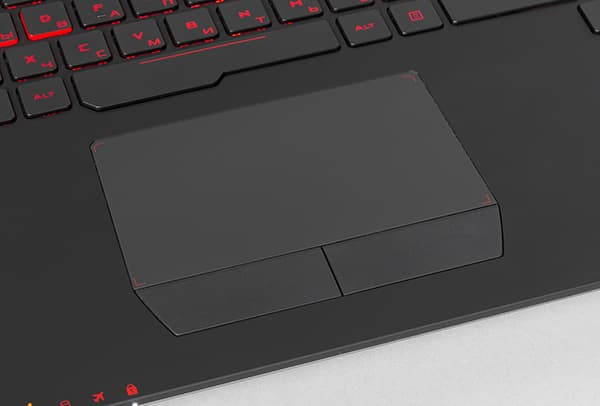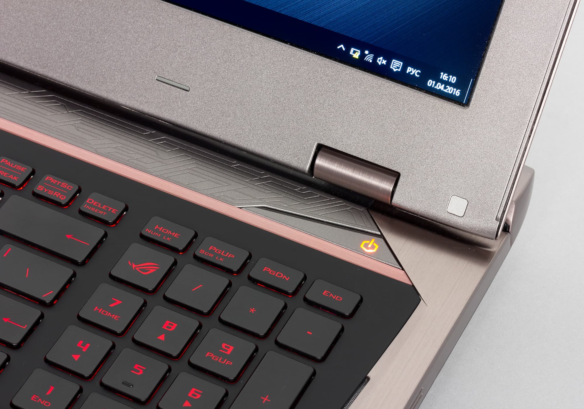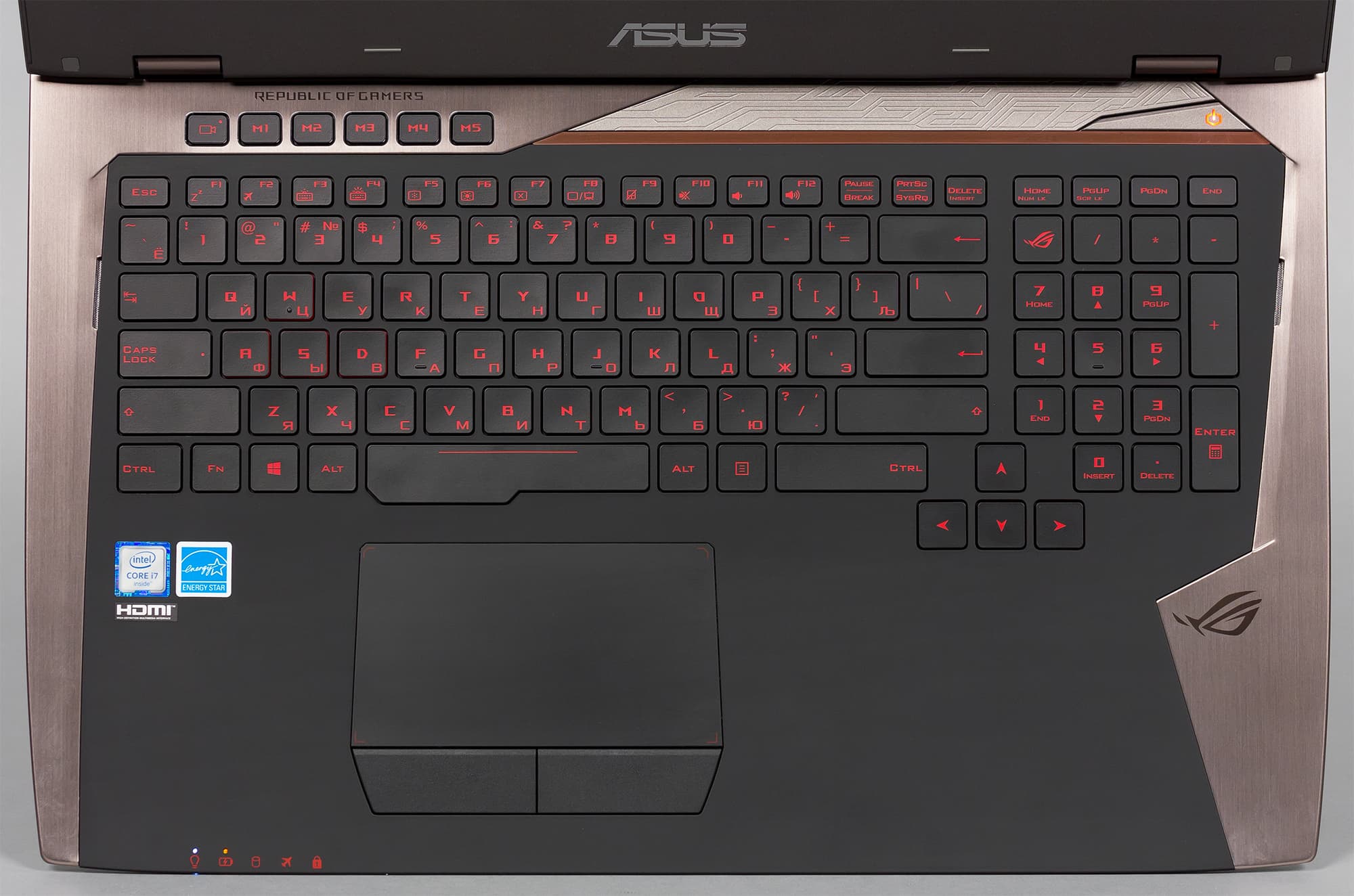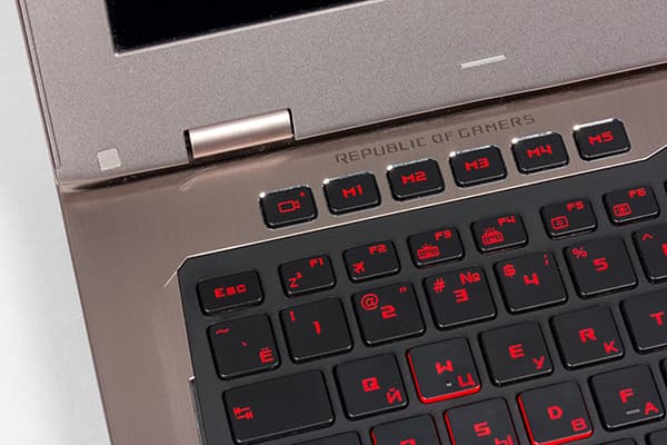 Клавиатура в ноутбуке оптимизирована под нужды геймеров. Клавиши W, A, S, D, которые наиболее часто используются в играх, немного отличаются от всех остальных. Это отличие заключается в том, что если во всех клавишах боковые поверхности (окантовка) имеют черный цвет, то на игровых клавишах W, A, S, D боковые поверхности красного цвета. Есть на клавиатуре и специализированная клавиша Asus ROG, которая стала уже традиционной для игровых ноутбуков Asus. Кроме того, как уже отмечалось, имеется пять отдельных клавиш для записей макросов и отдельная клавиша для захвата видео с экрана с использованием функции ShadowPlay.