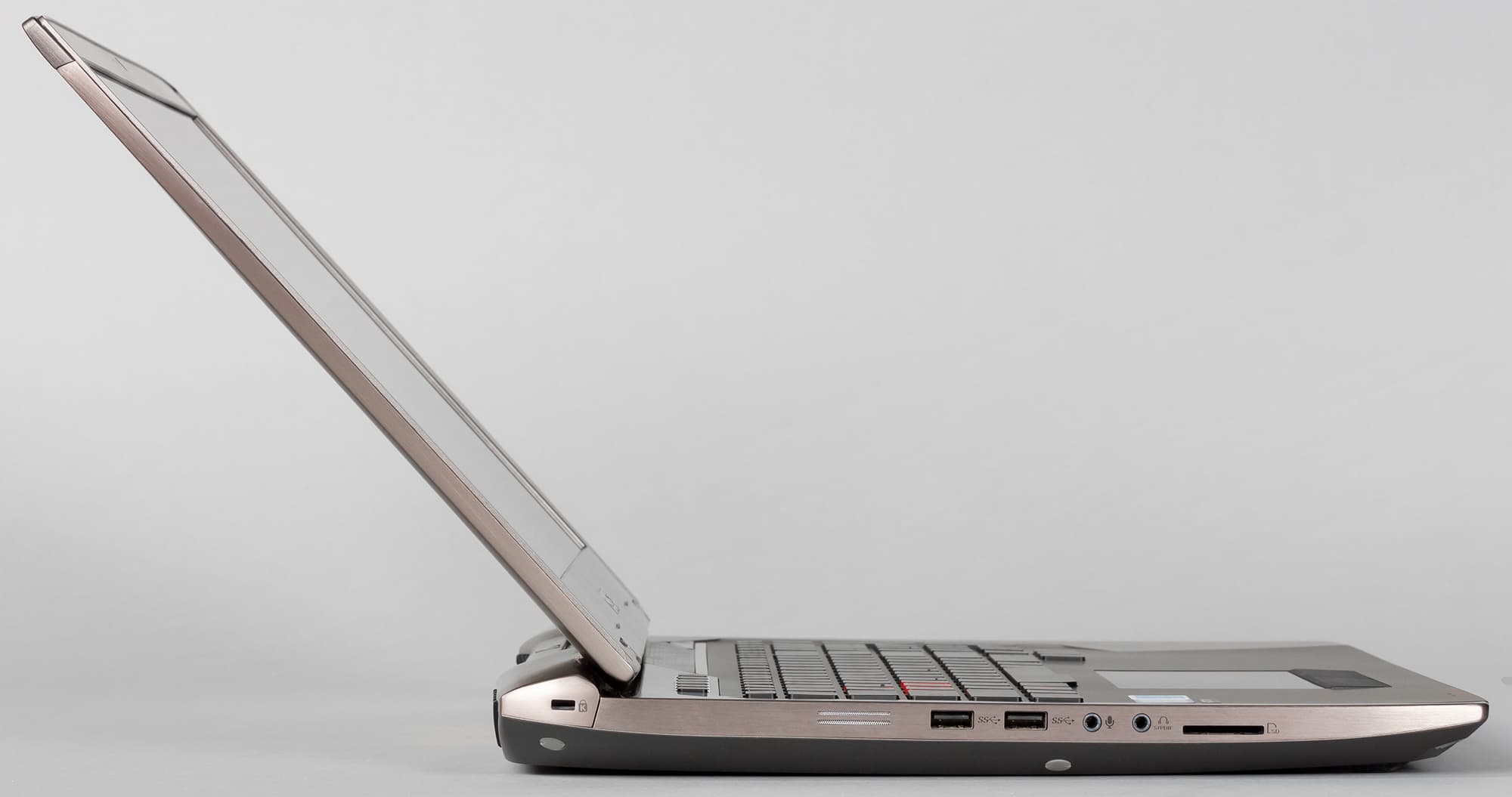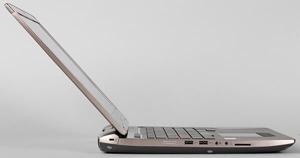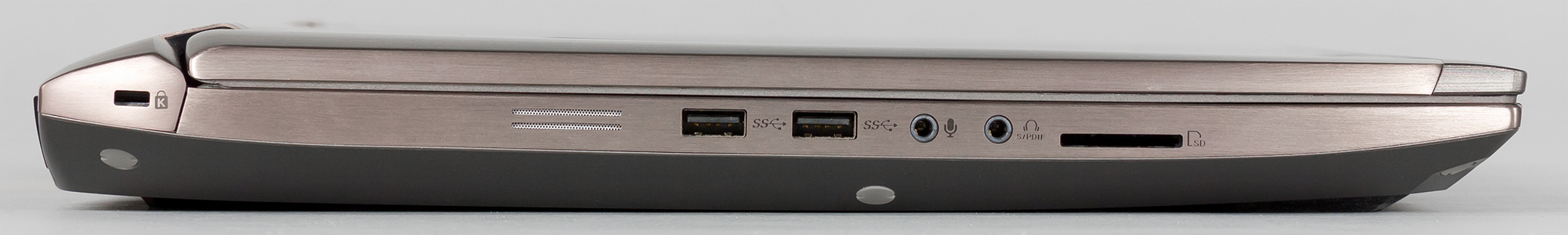 На левом торце корпуса ноутбука расположены два порта USB 3.0, слот для SD-карт памяти, отверстие для кенсингтонского замка и два аудиоразъема типа миниджек.