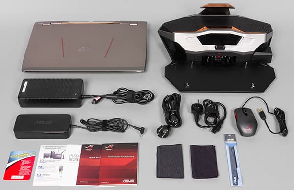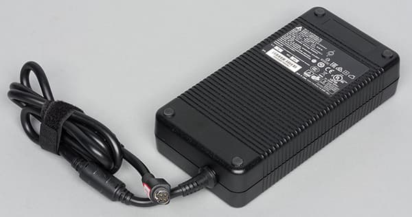 Кроме ноутбука в комплект поставки входят два адаптера питания. Один, мощностью 330 Вт (19,5 В; 16,9 А), используется в том случае, если ноутбук подключается к жидкостной системе охлаждения, а второй, мощностью 180 Вт (19,5 В; 9,23 А), используется в том случае, если ноутбук работает в обычном режиме.
