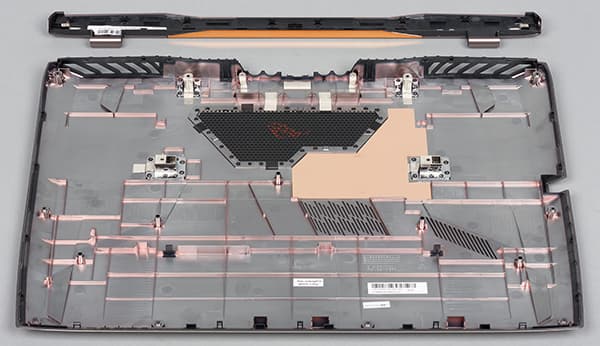 Нижняя панель корпуса ноутбука сделана из пластика серебристого цвета, стилизованного под шлифованный металл. На нижней панели расположены вентиляционные сетки, а также имеется полупрозрачная вставка из черного оргстекла (исключительно моддинговый элемент). Для устойчивого положения ноутбука на горизонтальной поверхности на нижней панели есть четыре прорезиненные ножки.