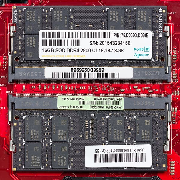 Для установки модулей памяти в ноутбуке Asus ROG GX700VO предназначено четыре слота, а максимальный объем памяти, который можно установить, составляет 64 ГБ. В нашем случае в ноутбуке было установлено только два одинаковых модуля памяти Apacer DDR4-2800 емкостью по 16 ГБ каждый (суммарный объем 32 ГБ). Однако частота 2800 МГц реализуется через XMP-профиль, который может быть активирован при разгоне системы.