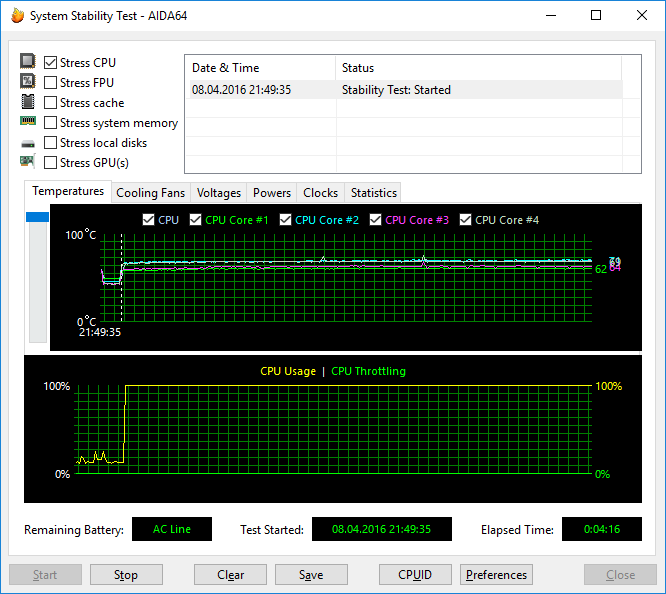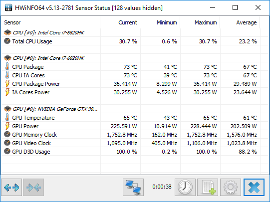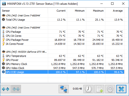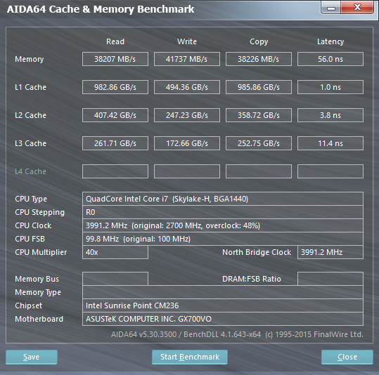 Итак, основой нашего ноутбука Asus ROG GX700VO-GC009T является четырехъядерный процессор Intel Core i7-6820HK в сочетании с мобильным чипсетом Intel CМ236. Процессор Intel Core i7-6820HK имеет номинальную тактовую частоту 2,7 ГГц, которая в режиме Turbo Boost может повышаться до 3,6 ГГц. Размер его кэша L3 составляет 8 МБ, а расчетная максимальная мощность — 45 Вт. Это единственный на сегодняшний день мобильный процессор Skylake с разблокированным коэффициентом умножения, то есть его можно разгонять. Естественно, в варианте ноутбука возможность разгона зависит не только от самого процессора, но и от того, какие инструменты для этого предоставляет производитель. Как именно это реализовано в ноутбуке Asus ROG GX700VO-GC009T, мы расскажем далее.