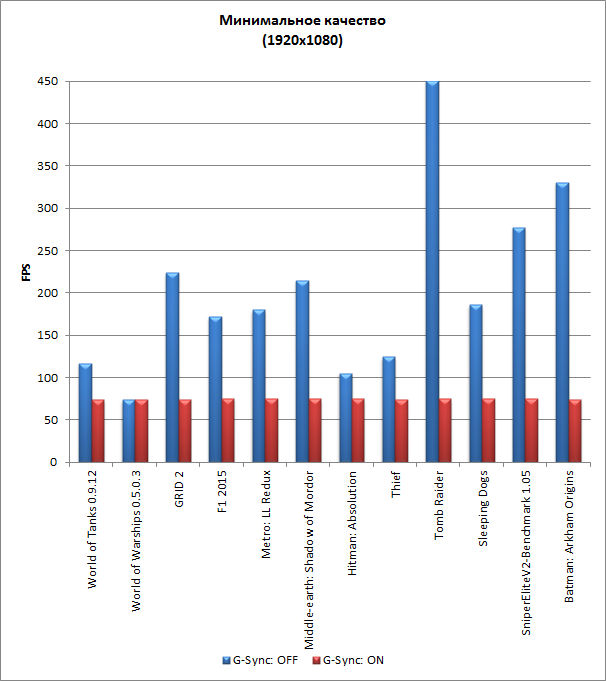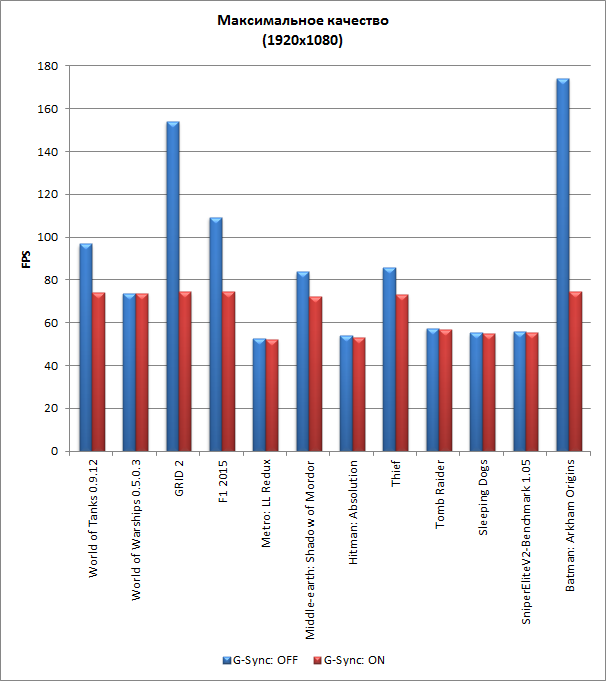 Как видим, технологии G-Sync ограничивает максимальную производительность по всех играх на уровне примерно 75 FPS. Тем не менее, этого вполне достаточно, чтобы комфортно играть. Главный вывод в данном случае следующий: при активированной технологии G-Sync можно комфортно играть во все игры при настройках на максимальное качество в разрешении 1920×1080.