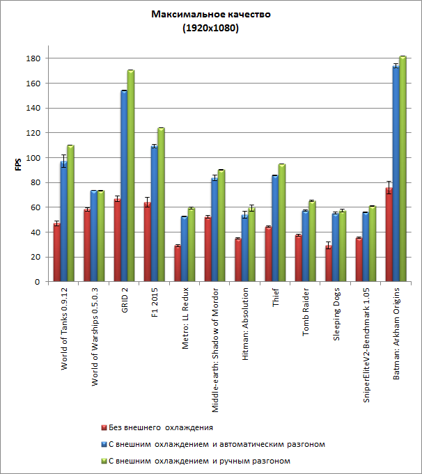 Теперь забудем о технологии G-Sync и рассмотрим, как будет меняться производительность ноутбука в играх в различных режимах его работы. То есть сравним результаты тестирования для режимов без подключения к блоку охлаждения, с подключением к блоку охлаждения и автоматическим разгоном и с подключением к блоку охлаждения и ручным разгоном видеокарты. Во всех этих тестах технология G-Sync не используется, дабы не ограничивать производительность.