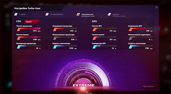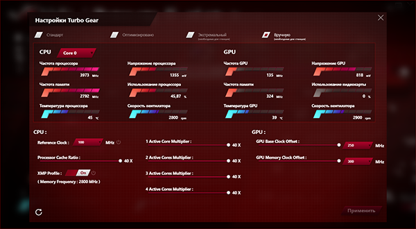 Если точнее, то для автоматического разгона нужно еще, чтобы на ноутбуке была установлена утилита Asus Gaming Center. В противном случае, то есть без этой утилиты, поведение ноутбука, как показала практика, может быть непредсказуемым (в плане тактовых частот процессора и видеокарты). Впрочем, о частотах процессора и видеокарты мы расскажем чуть позже.