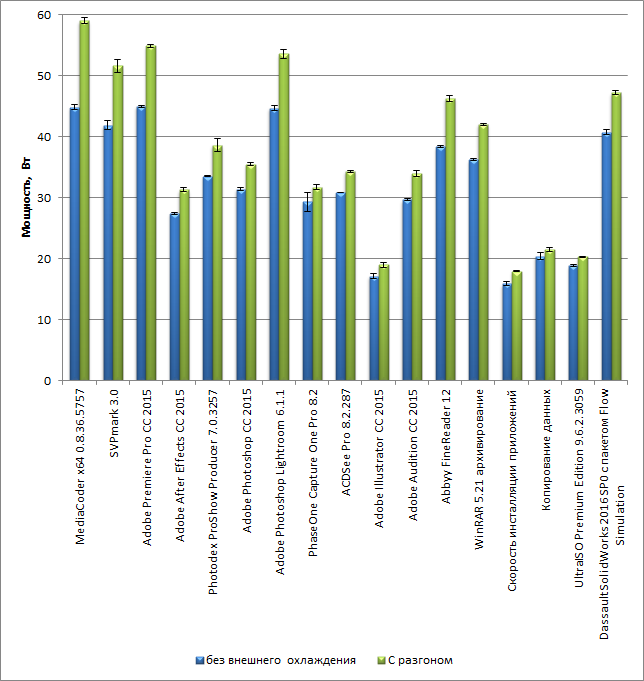 В режимах с внешним блоком охлаждения, то есть при разгоне процессора, мощность потребления, естественно, возрастает. Тем не менее, даже при разгоне мощность потребления процессора не превышает 60 Вт.
