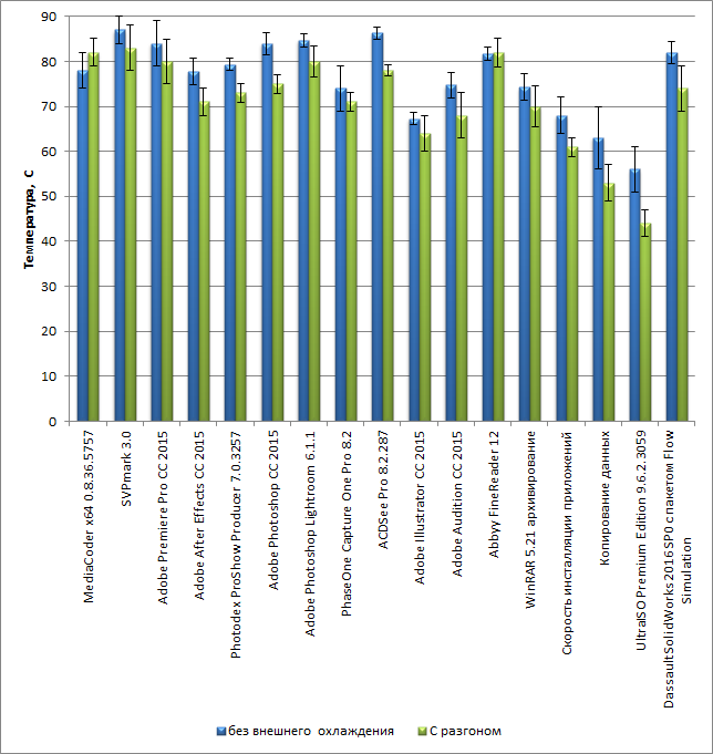 Теперь посмотрим на максимальную температуру процессора, которая достигается в ходе каждого отдельного теста. Результаты мониторинга представлены в таблице и на диаграмме.