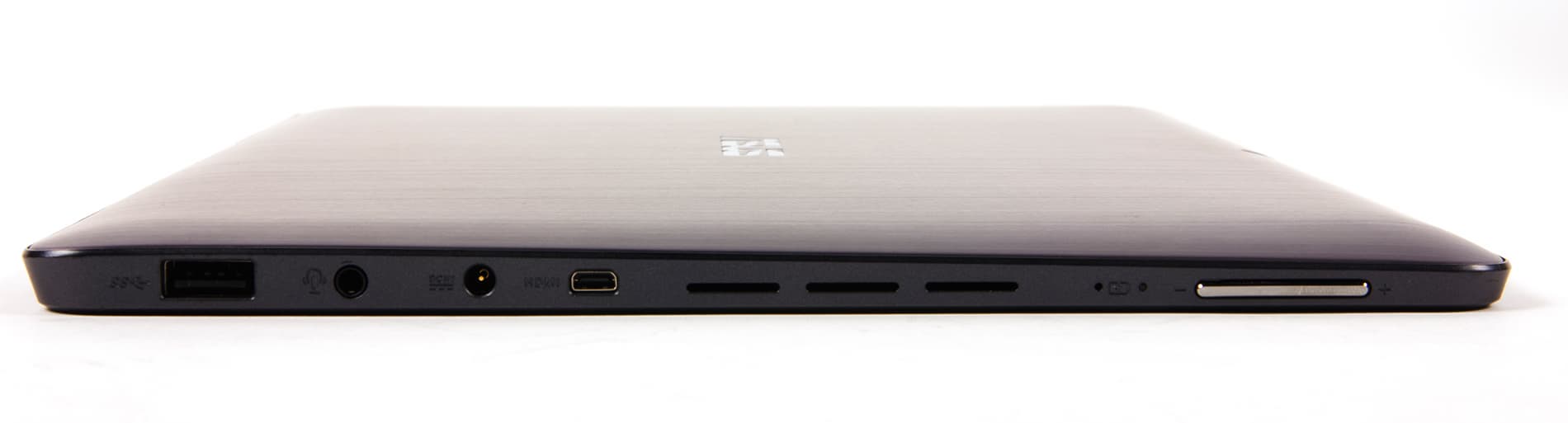 Планшетная часть ноутбука, то есть, отсоединяемый экран, имеет один интерфейс USB 3.0 и разъем Micro-HDMI для подключения внешнего монитора. Оба разъема расположены на левом торце планшета. Кроме того, на левом торце имеется аудиоразъем типа mini-jack для подключения наушников, разъем питания, клавиша качельного типа для управления громкостью звука и светодиодный индикатор заряда аккумулятора. Этот индикатор горит белым цветом, если док-станция или планшет подключены к источнику питания, а аккумулятор заряжен на 95-100%. Если же этот аккумулятор горит оранжевым цветом, то это означает, что док-станция работает от сети, а аккумулятор заряжен менее, чем на 95%, или же планшет подключен к док-станции для подзарядки, а заряд аккумулятора менее 30%. Мигающий оранжевый цвет аккумулятора означает, что док-станция или планшет работают от сети, а заряд аккумулятора менее 10%. НУ и если индикатор не горит, то это означает, что док-станция или планшет работают от аккумулятора, а уровень заряда находится в диапазоне от 10 до 100%.