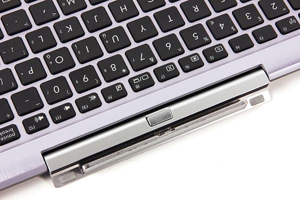 Система крепления экрана к док-станции представляет одну длинную шарнирную петлю, которая расположена в верхней части док-станции (над клавиатурой). В этой петле имеется магнитный паз, в который и устанавливается экран. Для того, чтобы отсоединить экран от док-станции, необходимо нажать на кнопку, расположенную сверху по центру шарнирной петли. Кроме того, после подсоединения клавиатурной док-станции для ее подключения необходимо ее подключить, используя для этого специальный тумблер, расположенный в верхнем левом углу док-станции. Рядом с этим тумблером имеется индикатор, который загорается при включении док-станции. Также имеется и традиционный индикатор Caps Lock.