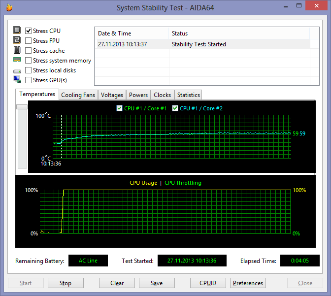 При загрузке процессора тестом Stress CPU (утилитой AIDA64 Extreme Edition — тест на стабильность системы), который использует целочисленные вычисления, частота процессор составляет 2,3 ГГц. (напомним, что для процессора Intel Core i5-4200U максимальная частота в режиме Intel Turbo Boost составляет 2,6 ГГц). Температура процессора в этом режиме загрузки не превосходит 60 °С.