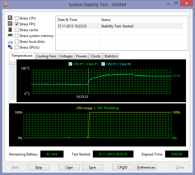 При загрузке процессора тестом Stress FPU, который использует вычисления c плавающей точкой и в большей степени нагревает процессор, максимальная устоявшаяся частота процессора составляет 1,9 ГГц, а температура ядер процессора не превышает 75 °С.