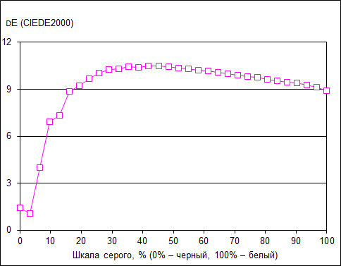 Что касается точности цветопередачи (дельта Е), то ее значение остается дловольно стабильным по всей шкале серого (темные области мы не учитываем) и состаывляет от 9 до 11 единиц. В принципе, это приемлемое значение для такого класса устройств.