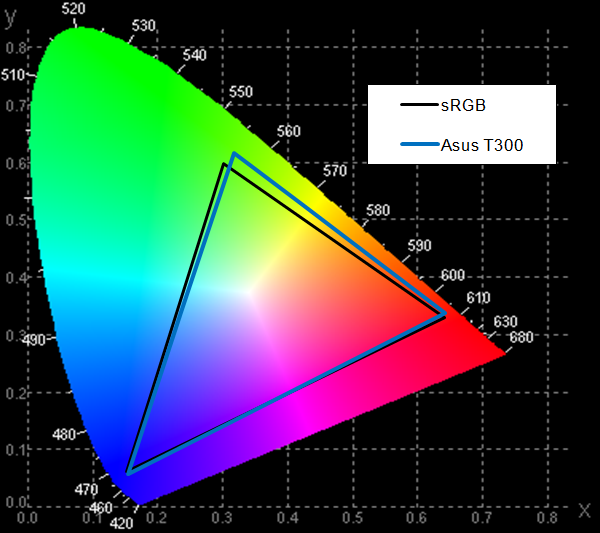 Цветовой охват ЖК-экрана в ноутбуке Asus Transformer Book T300LA покрывает 91,3% пространства sRGB и 66,8% Adobe RGB, а объем цветового охвата составляет 100% от объема sRGB и 68,9% от объема Adobe RGB. В принципе, это очень хороший результат.