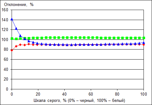 Стабильность цветовой температуры объясняется тем, что во всем диапазоне по шкале серого баланс основных цветов остается неизменным.