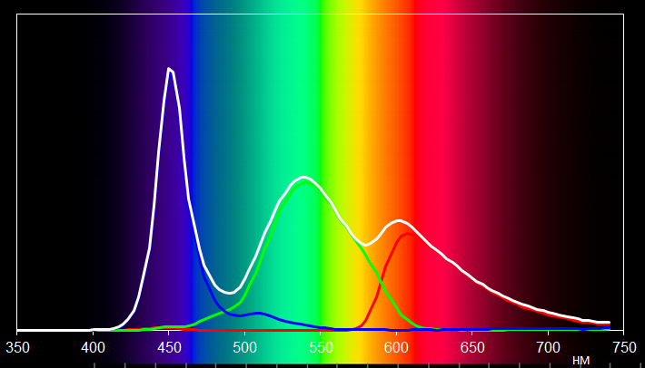 Светофильтры ЖК-матрицы немного подмешивают компоненты друг к другу. В результате, спектры красного и зеленого цветов частично перекрываются. В то же время, спектр синего цвета хорошо изолирован. В принципе, такая ситуация вполне типична для ЖК-матриц, используемых в ноутбуках.