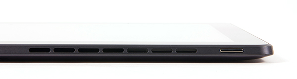 На самой клавиатурной док-станции на ее левом торце имеется лишь один разъем microUSB, который предназначен для зарядки аккумулятора самой клавиатурной док-станции. При этом предполагается, что для зарядки док станции необходимо его соединить USB кабелем (он должен входить в комплект поставки) с планшетом. Собственно, в этом, на наш взгляд, заключается еще один недостаток данного ноутбука. То есть, если вы хотите подзарядить док-станцию, то придется занять единственный порт USB на планшете, что, конечно же, неудобно. Да и постоянно таскать с собой еще один кабель — это совсем не комильфо. И почему не предусмотрена возможность заряда док-станции непосредственно через планшет, когда он подключен — абсолютно не понятно. Ведь такое решение и логично и удобно.