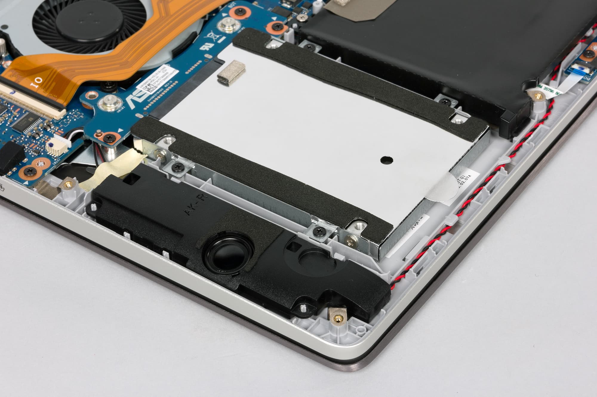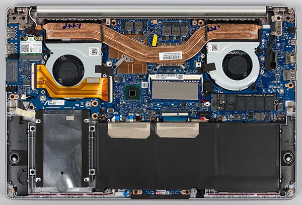 Сняв нижнюю панель корпуса, можно получить доступ к аккумуляторной батарее, SSD-накопителю, HDD, модулю беспроводной связи, модулю памяти и системе охлаждения.