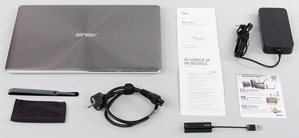 Ноутбук Asus ZenBook Pro UX501 поставляется в компактной картонной коробке с ручкой, в комплект его поставки входит адаптер питания мощностью 120 Вт (19 В; 6,32 А), переходник USB — RJ-45 и стандартный комплект документации.