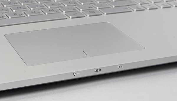 Индикаторы состояния в этом ноутбуке вынесены на передний торец корпуса. Всего таких индикатора три: включения питания, заряда аккумулятора и активности подсистемы хранения данных.