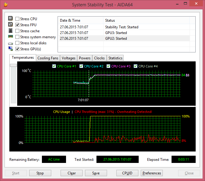 В режиме одновременной загрузки и ядер процессора (Stress FPU), и графического ядра (Stress GPU) частота ядер процессора опускается до 2,0 ГГц, а их температура составляет примерно 85 °C. В этом режиме также наблюдается троттлинг.