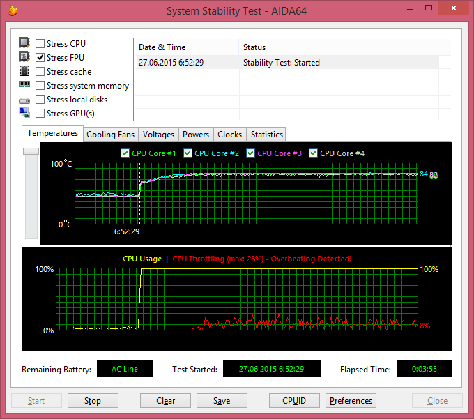 При загрузке процессора тестом Stress CPU (утилитой AIDA64 Extreme Edition — тест на стабильность системы), который использует целочисленные вычисления, частота процессора составляет 3,4 ГГц. (напомним, что для процессора Intel Core i7-4720HQ максимальная частота процессора в режиме Turbo Boost составляет 3,6 ГГц). Температура процессора в этом режиме загрузки увеличивается до 80 °C.