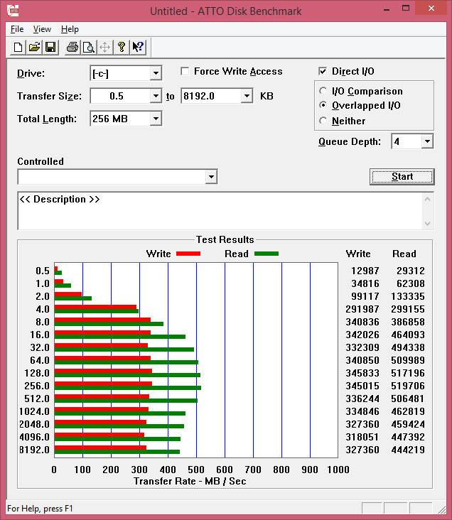Утилита ATTO Disk Benchmark определяет максимальную скорость последовательного чтения на уровне почти 510 МБ/с, а скорость последовательной записи — на уровне почти 340 МБ/с. Это неплохой результат для SSD-накопителя, но бывает и лучше.